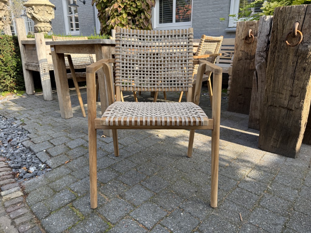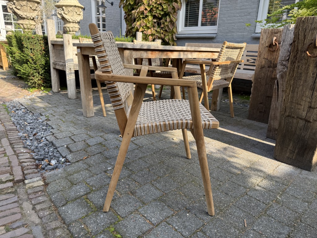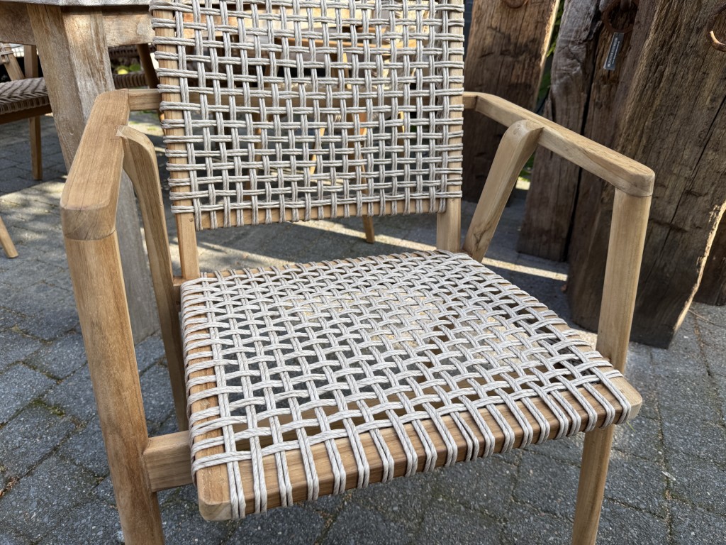 Teakhouten tuinstoel ‘Gina’. De stoelen zijn opstapelbaar en dus gemakkelijk op te slaan.