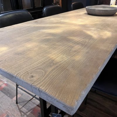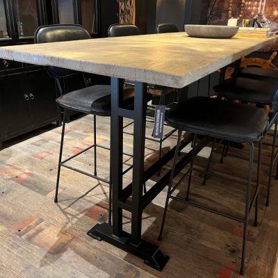 Landelijke bartafel, gemaakt van elmwood en een zwart gepoedercoat metalen onderstel.