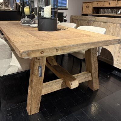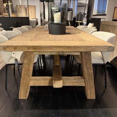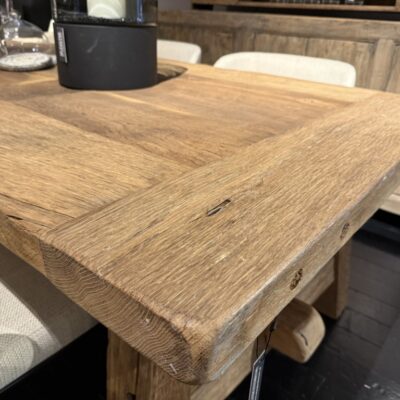 Robuuste eettafel met een houten onderstel, gemaakt van steeneikenhout. Ook in andere afmetingen verkrijgbaar.