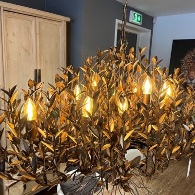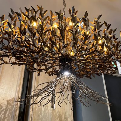 Chandelier ‘AIX Bronze’, gemaakt van ‘bronze finish’ aluminium. De lamp heeft 12 lichtbronnen en 1 LED spot die naar onder schijnt.