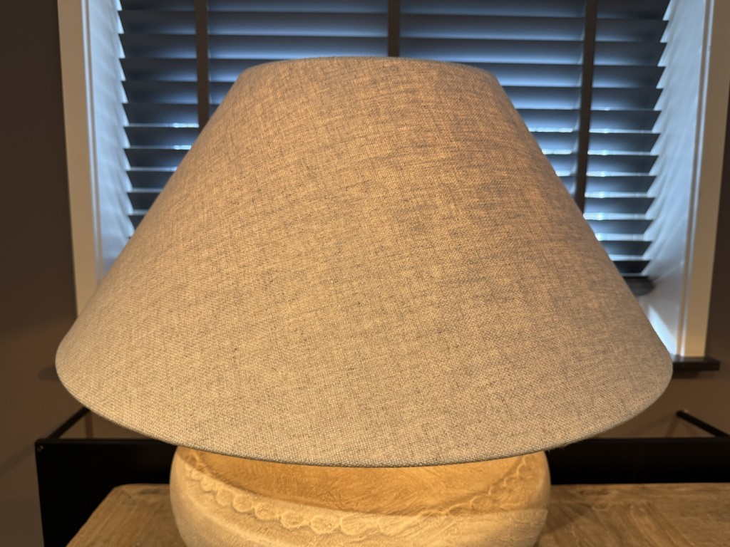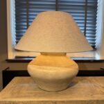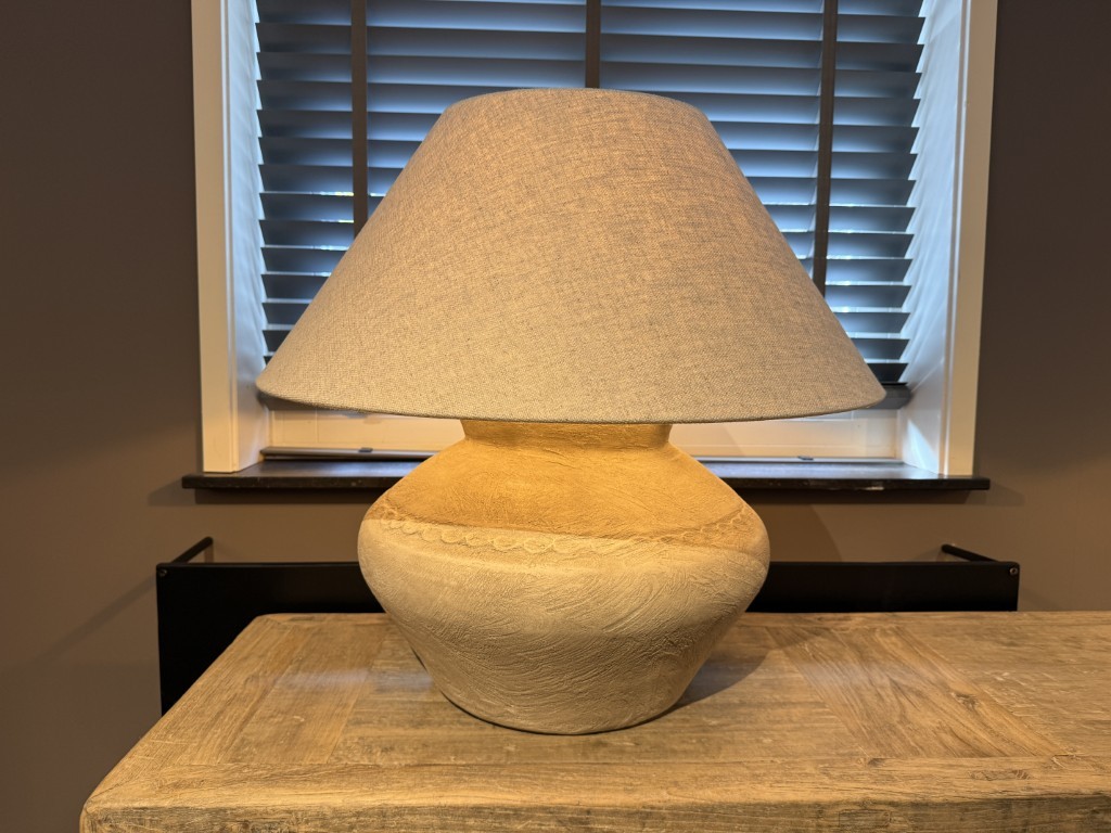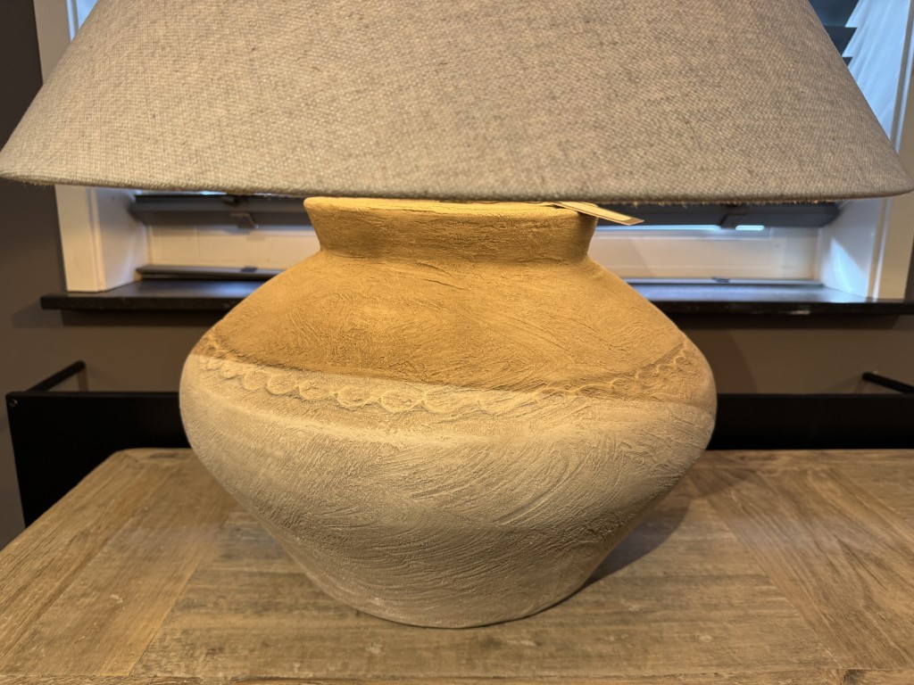 Kruiklamp ‘Tudino’, gemaakt van een aardewerk voet en een stoffen kap.