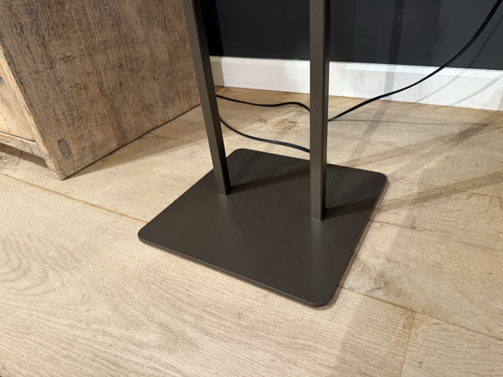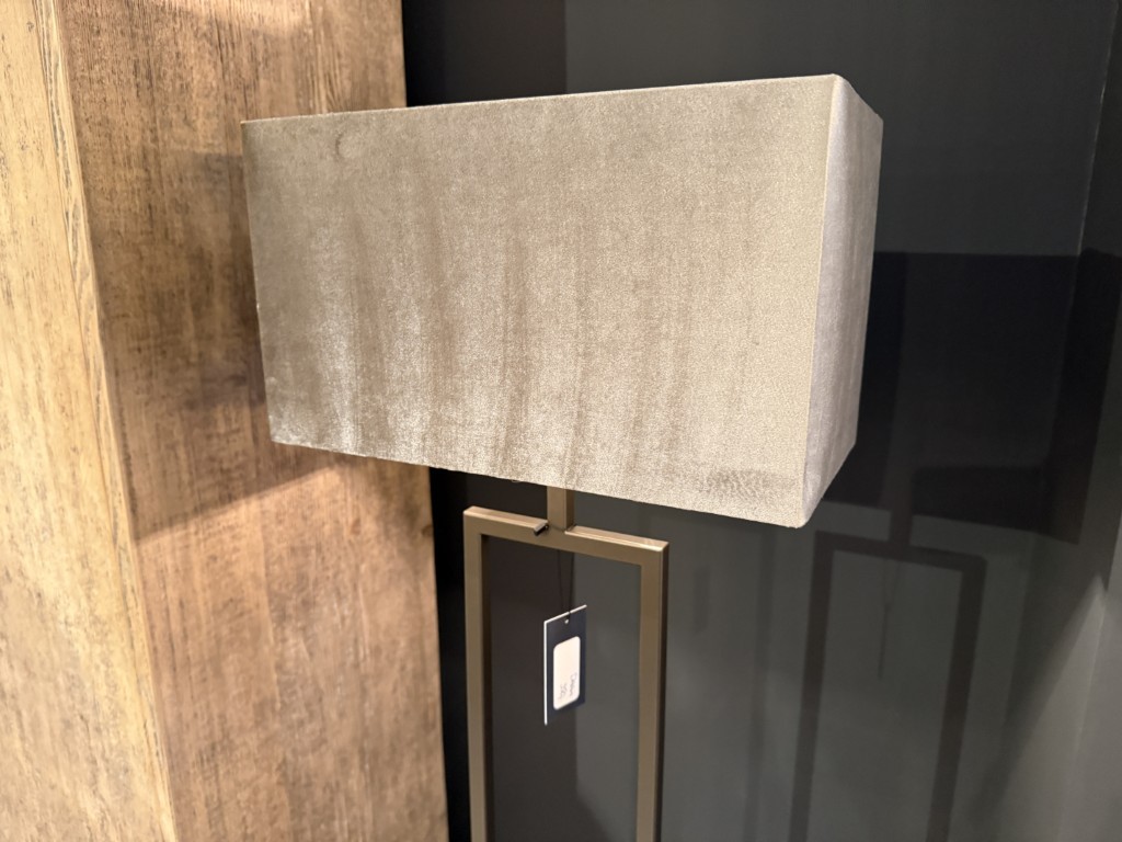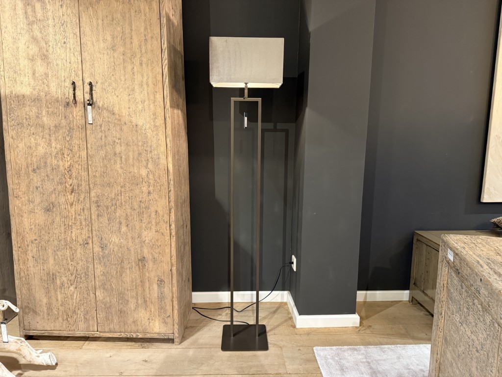 Vloerlamp ‘Daan’, gemaakt van een metalen voet en een kap van fluwelen stof.