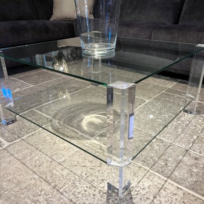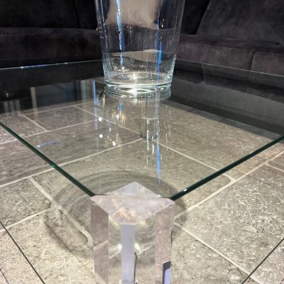 Vierkante salontafel, gemaakt van glas. De salontafel kan op maat besteld worden.