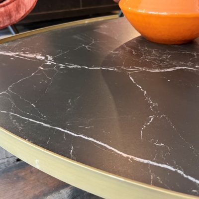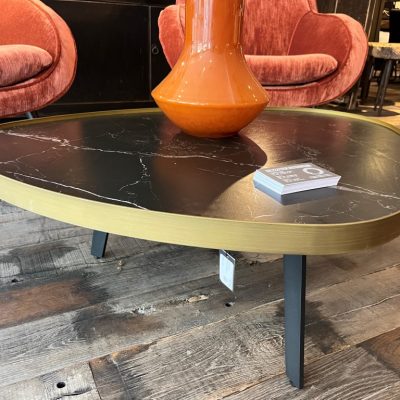 Marmeren salontafel ‘Capri’ met een organische vorm. De tafel heeft een frame van goud en zwart kleurig metaal.