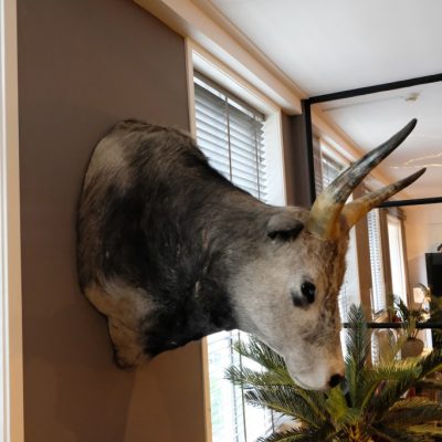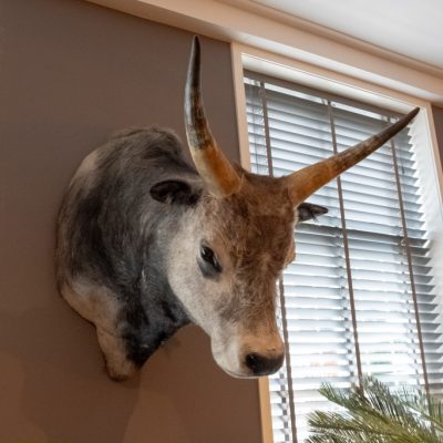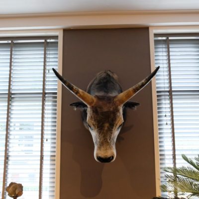 Opgezet hoofd van een koe met hoorns.