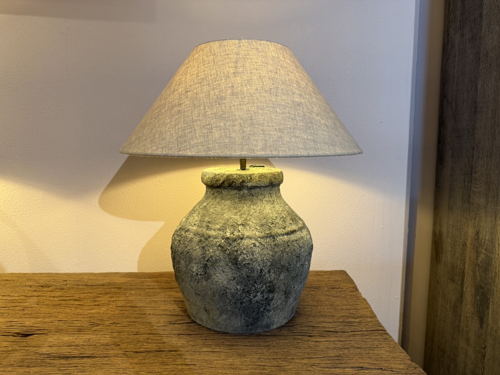 Kruglampe ‘Figo’, bestehend aus einem Steinsockel und einem Stoffschirm.