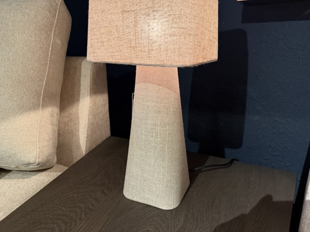 Tischlampe ‘Lizzano’ mit einem Tonton aus Leinenstoff. Der Lampensockel ist ebenfalls mit Leinenstoff bedeckt.