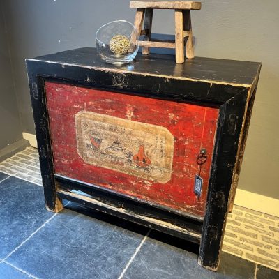 Antiker chinesischer Schrank mit 1 Tür mit Bemalung aus altem Kiefernholz.