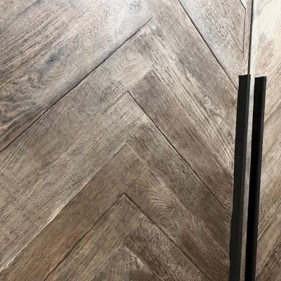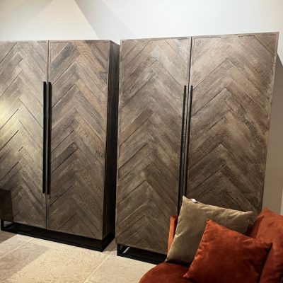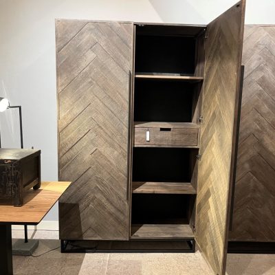 Eichenschrank ‘Dacota’ mit 2 Türen auf Metallrahmen. Die Türen haben ein Fischgrätenmuster.