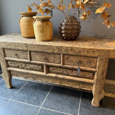 Antiker chinesischer Wandtisch mit 3 Schubladen, hergestellt aus altem Kiefernholz.
