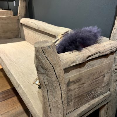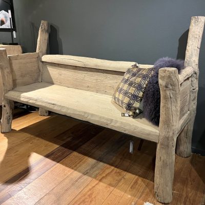 Ländliche Baumstammbank, gefertigt aus altem Kiefernholz.