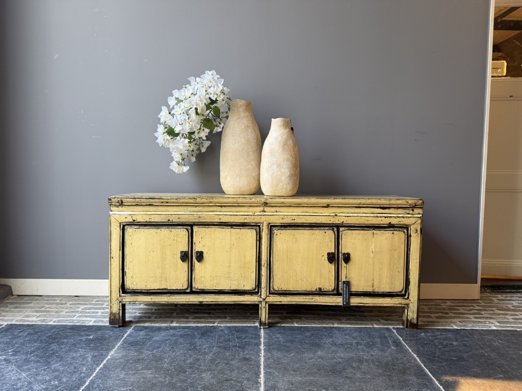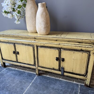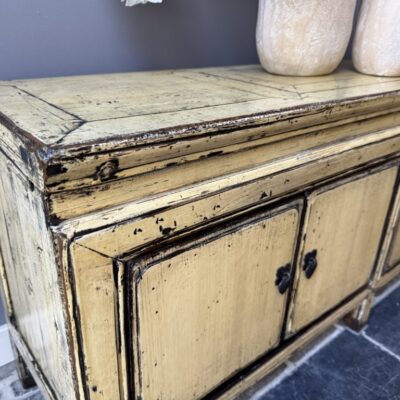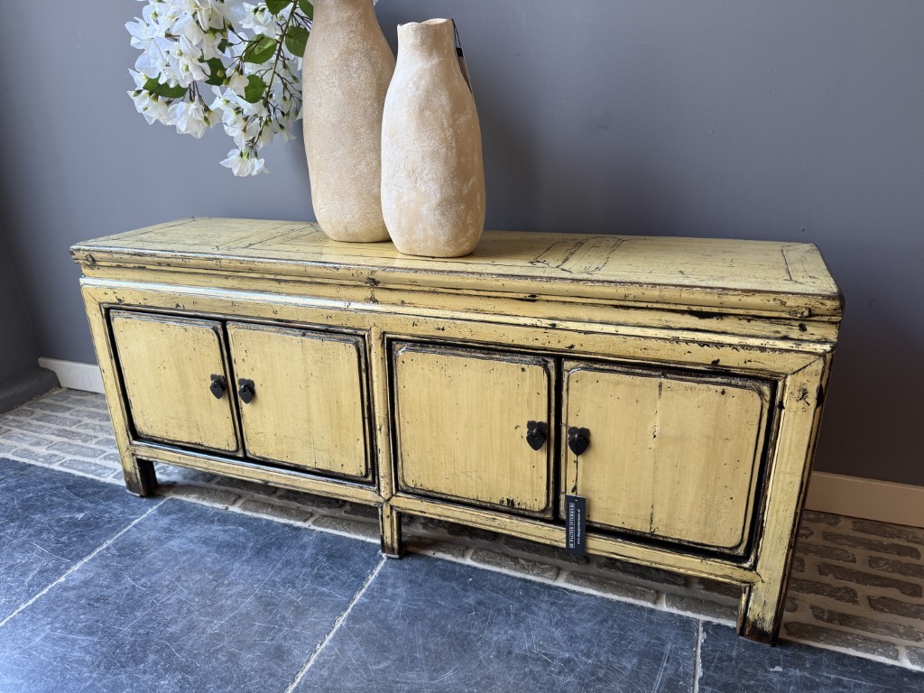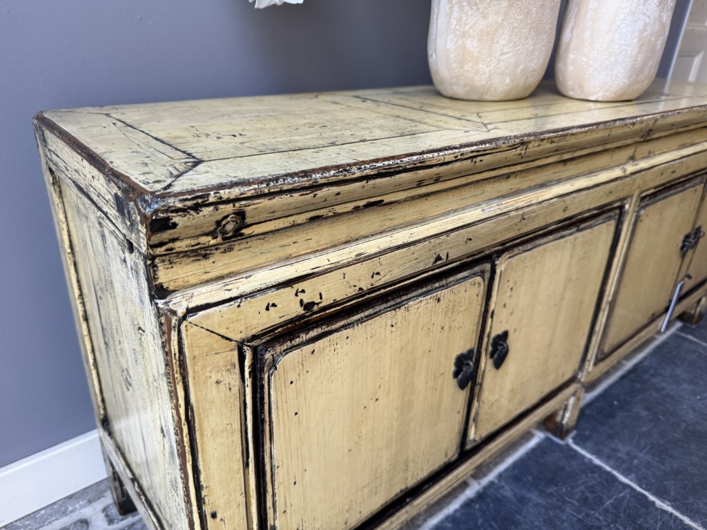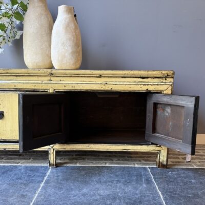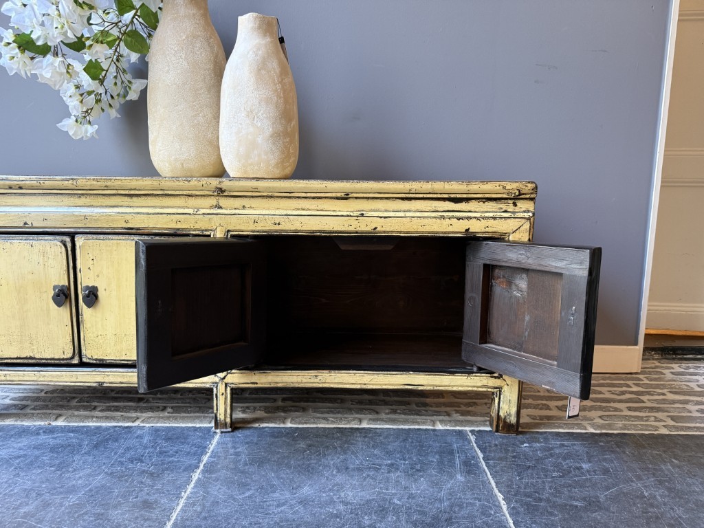 Beige lackiertes TV-Sideboard mit 4 Türen, gefertigt aus altem Kiefernholz.