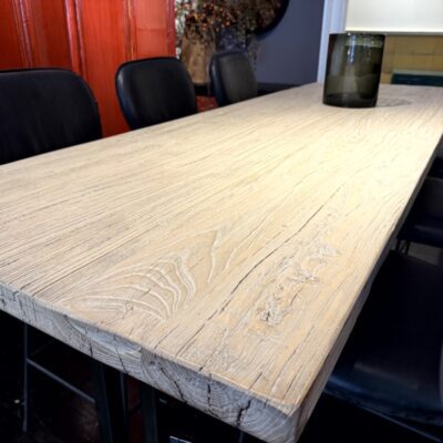 Halbhoher Stehtisch im Landhausstil, bestehend aus einer Tischplatte aus Ulmenholz und einem schwarz pulverbeschichteten Metallgestell.