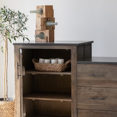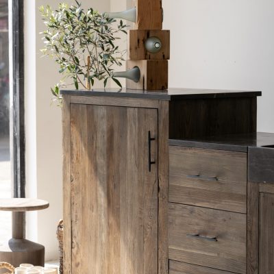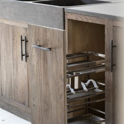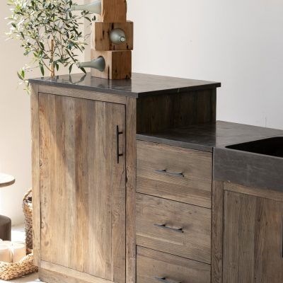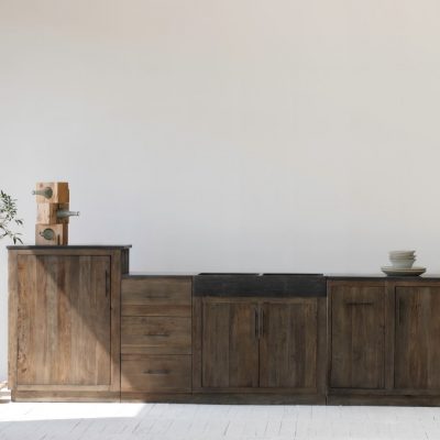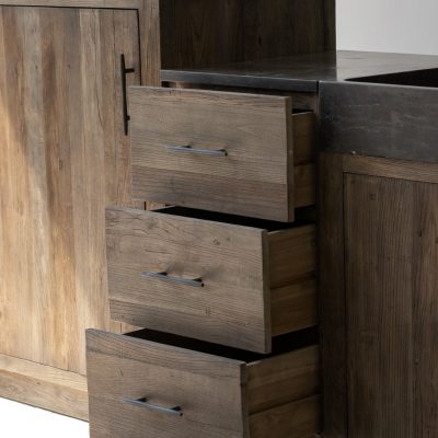 Von links nach rechts: Drei Schubladen, ein Schrank mit Doppeltüren, ein Schrank für Kräuter und Öle und ein Schrank mit einer einzigen Tür.
