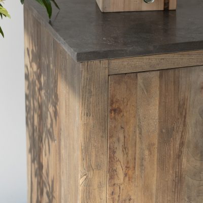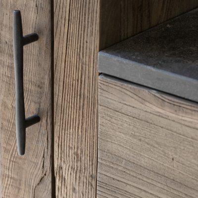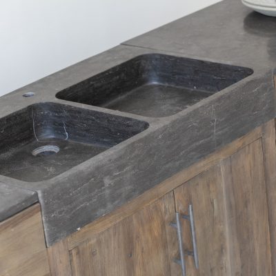 Elmwood küche aus altem Holz mit Granit-zähler und Doppelspüle.