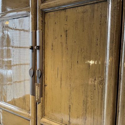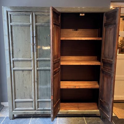 Grün lackierter Schrank ‘Montreal’ mit 4 Türen, aus altem Kiefernholz. Die Regale im Schrank sind abnehmbar.