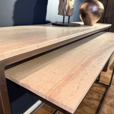 Set aus zwei Wandtischen mit einer Tischplatte aus Travertin und einem Metallgestell.