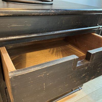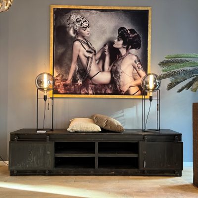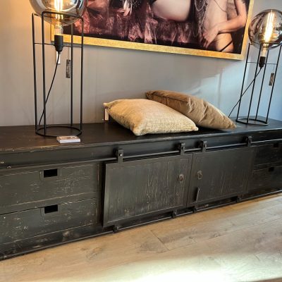Schwarzes TV-Sideboard ‘Dublin’ mit 2 Schiebetüren, 4 Schubladen und 4 offenen Fächern. Das Sideboard ist aus altem Kiefernholz und Metall gefertigt.