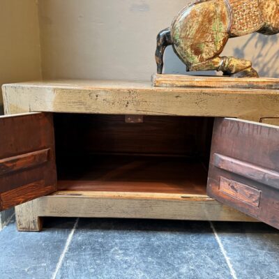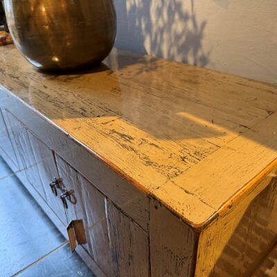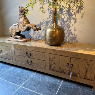 TV-Sideboard ‘Marina’, verziert mit grau/grünem Lack. Auch in schwarzem oder weißem altem Kiefernholz erhältlich.