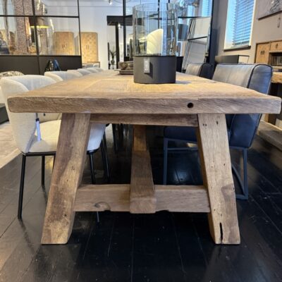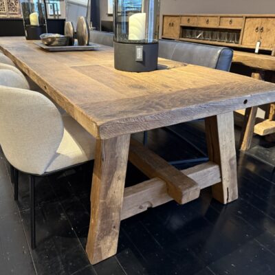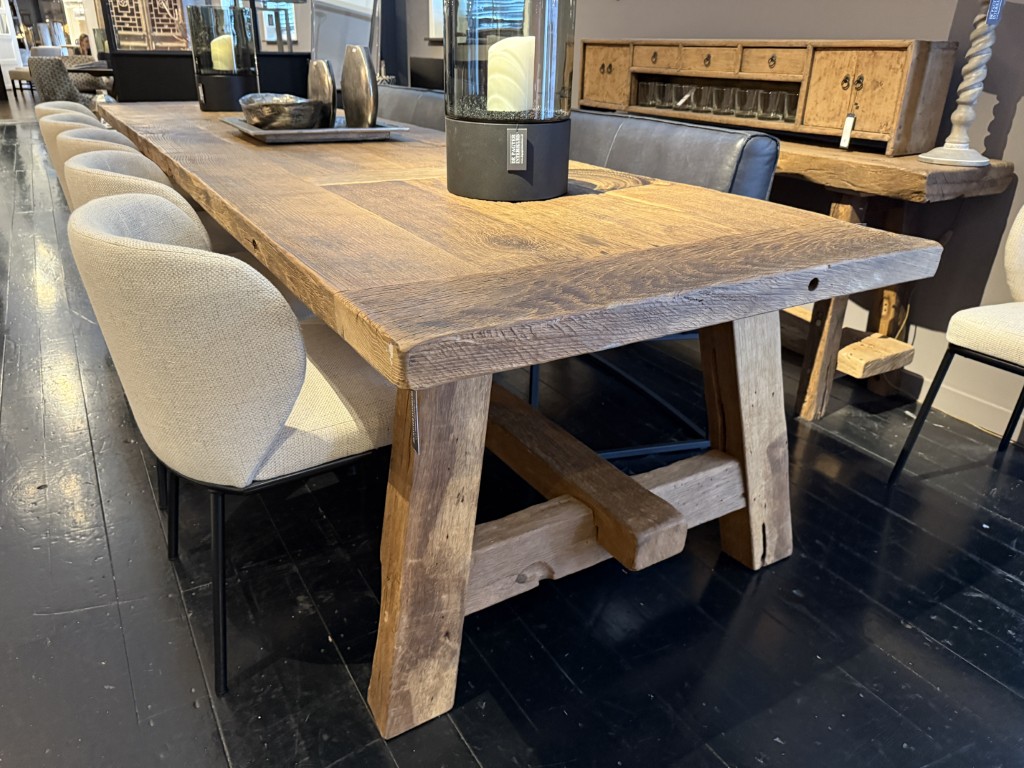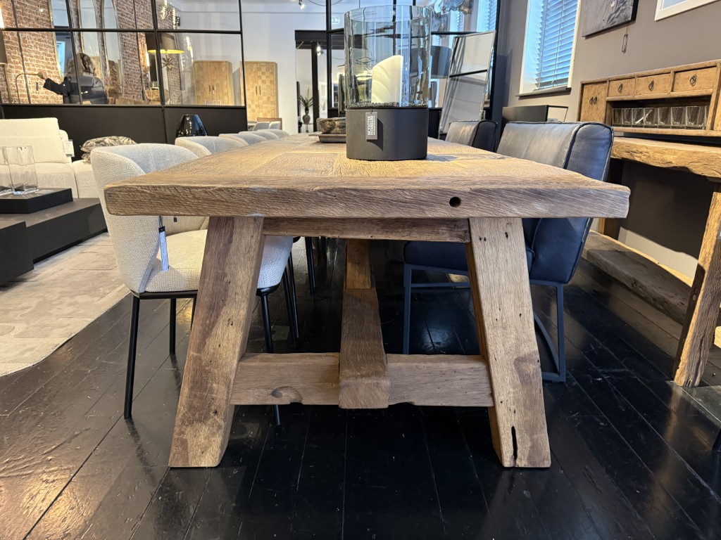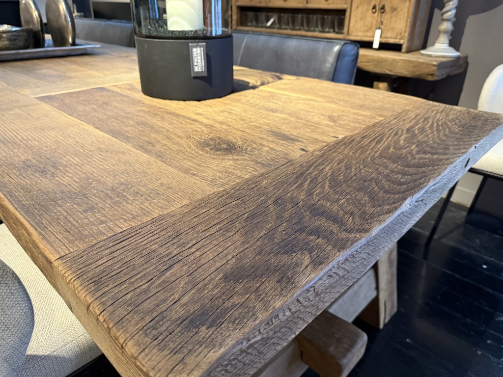 Robuster Tisch mit grober Holzbasis und Zwischenbalken, gefertigt aus Steineiche.