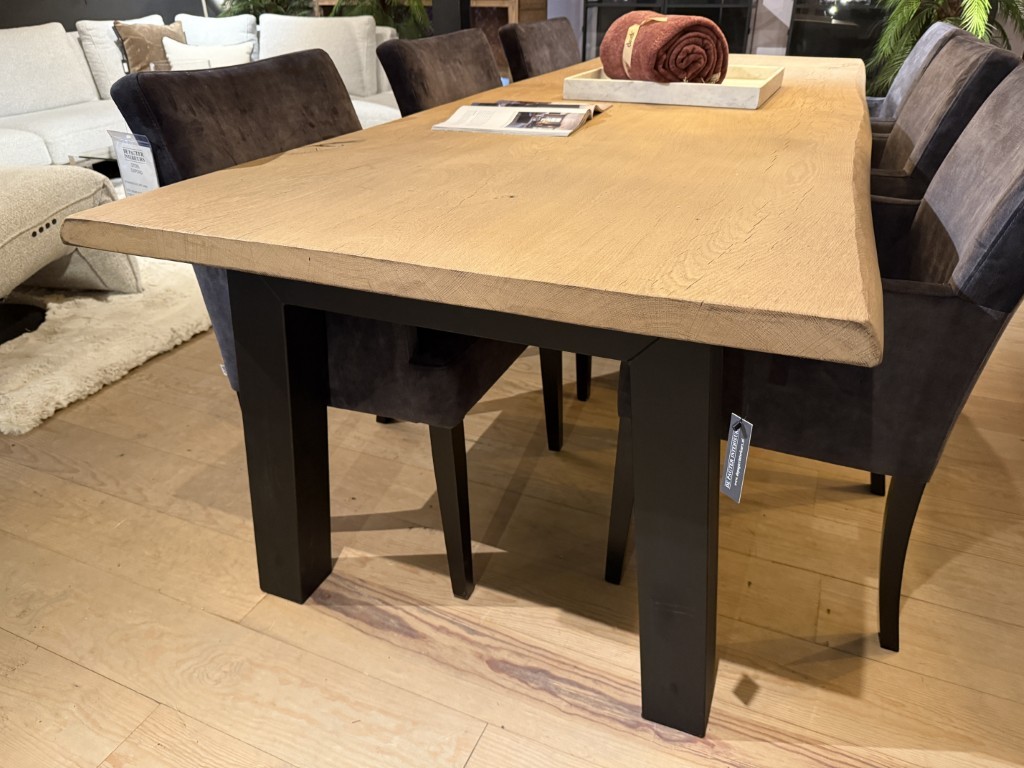 Dining table with a tabletop of rustic, baked oak wood and an N-profile base of black powder-coated metal.
