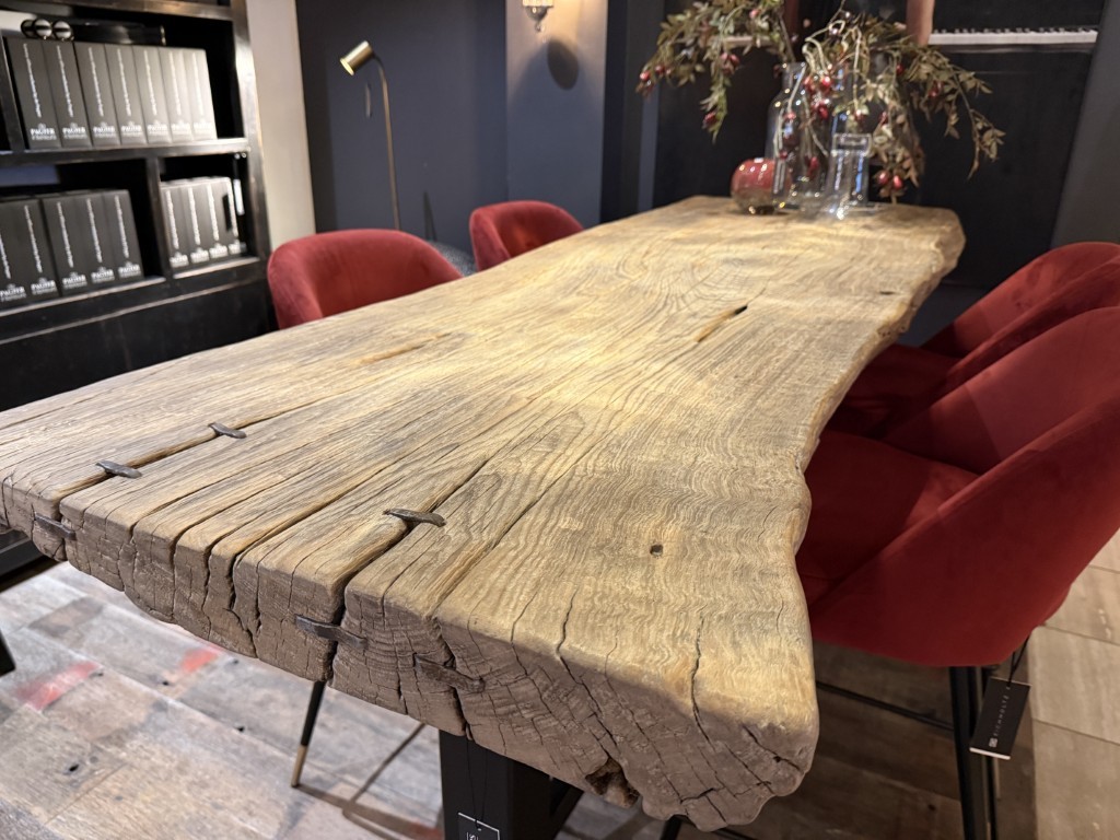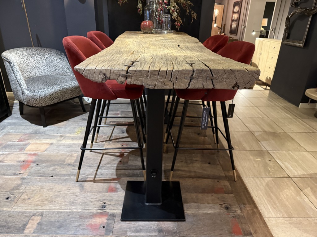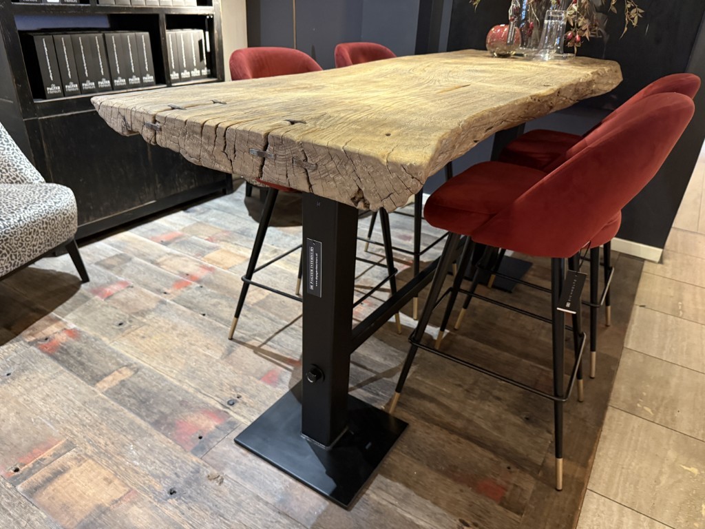 Bar table, made of a coarse elm wood tabletop and a base of black powder-coated metal.
