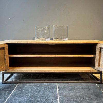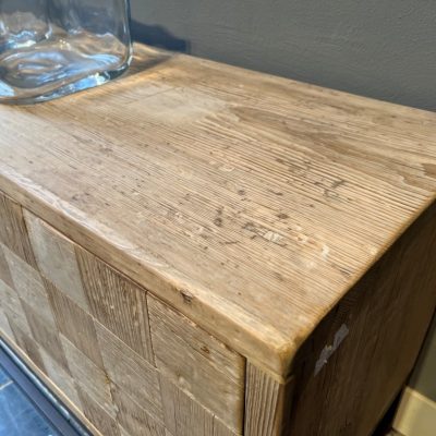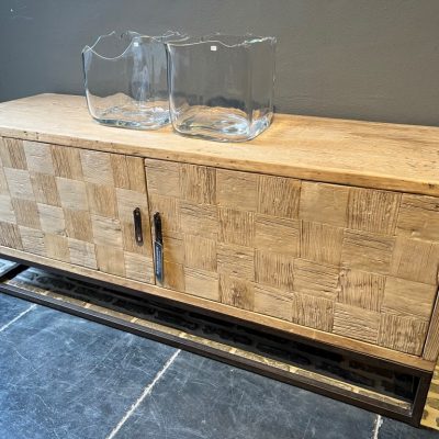 Elmwood cabinet with 2 checkered doors on a metal base.