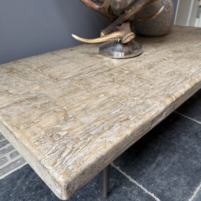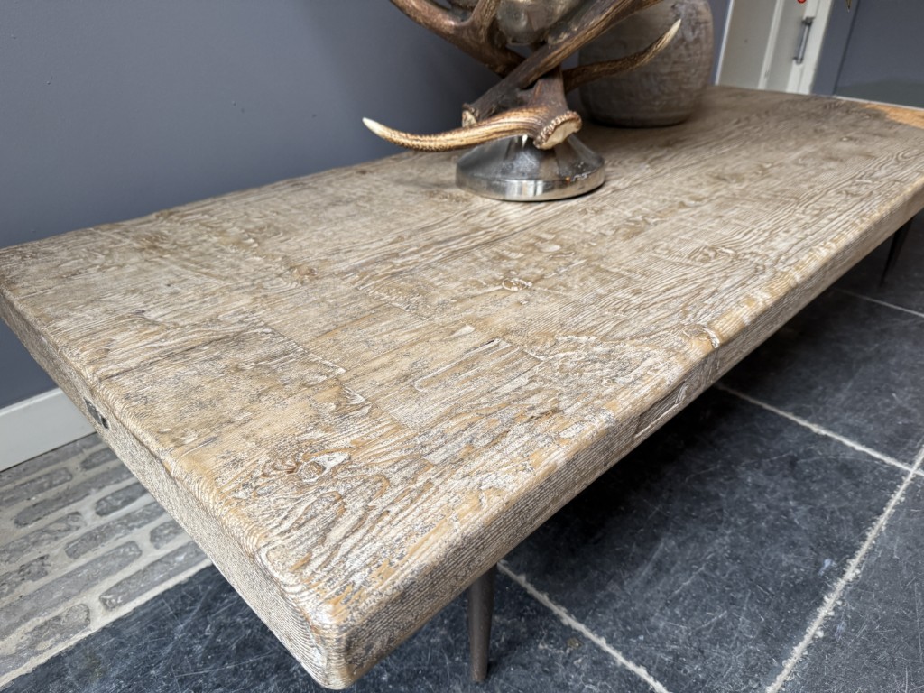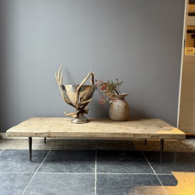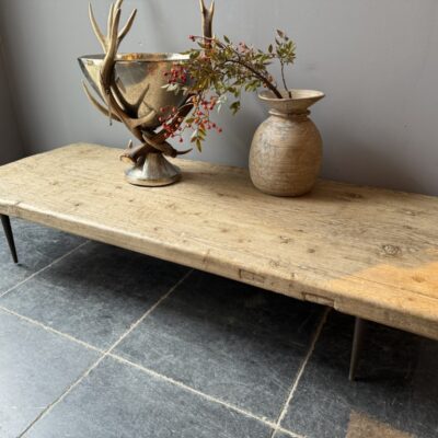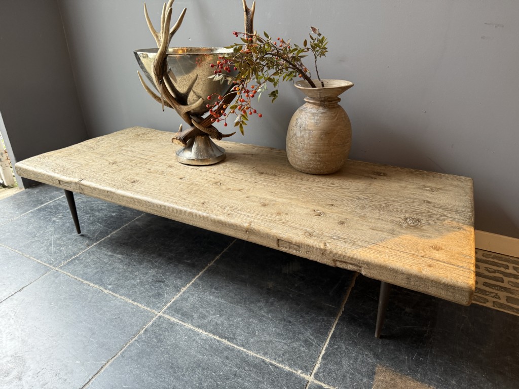 Coffee table, made of an old pine tabletop and 4 metal pointed legs.