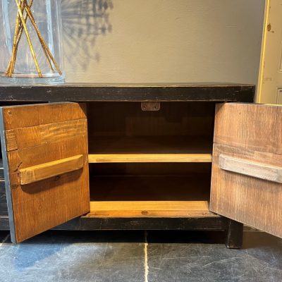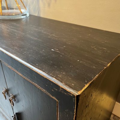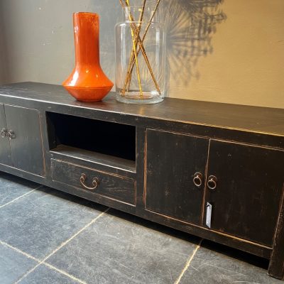 Black TV sideboard with 4 doors, 1 drawer and an open compartment, made of old pine wood. Also available in plain old pine wood.