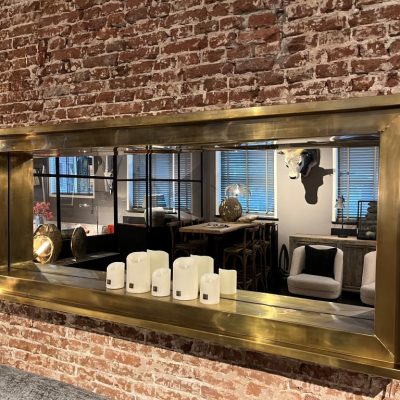 Mirror ‘Magenta’, made of gold-coloured aluminum. De spiegel is van het merk Eichholtz.