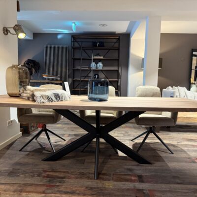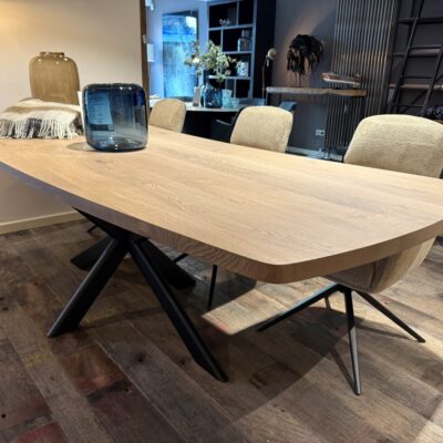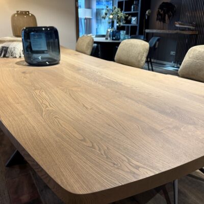 The Modena table is made of oak wood, in the color Cinnamon and in the shape: Pesse.