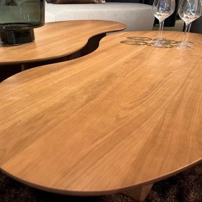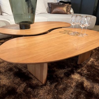 Organically shaped, oak coffee table ‘Boca’. Available in 12 colours. Shown here in color: Tobacco Oak.