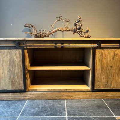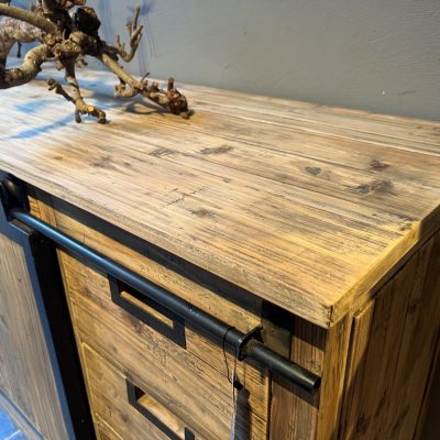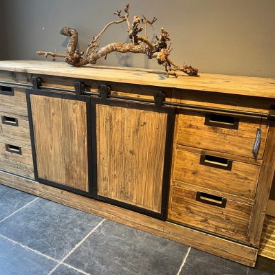 Sideboard ‘Lyon’ with 2 metal sliding doors and 6 drawers. The sideboard is made of old pine wood.