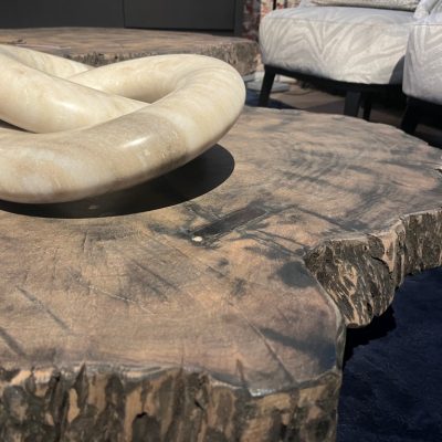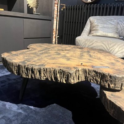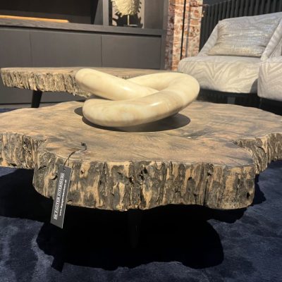 Tree trunk-shaped coffee table ‘Indigo’, made of a hardwood top and metal legs.