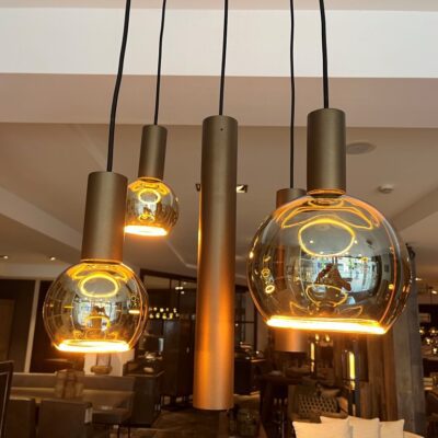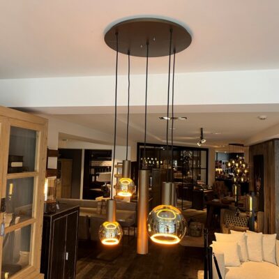 Hanging lamp ‘Riva’ with a round ceiling plate. The lamp comes with 5 light sources and is dimmable via an external dimmer.