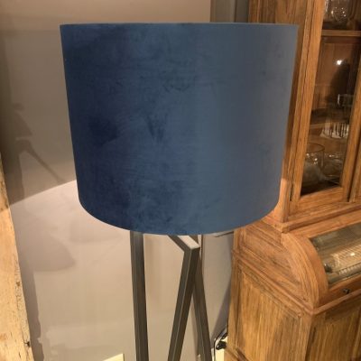 Industrial metal floor lamp with a blue velvet shade.