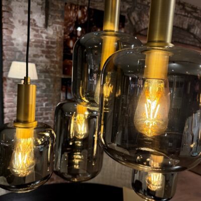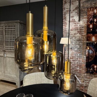 Pendant lamp ‘Matera’ with 5 light sources and a steel ceiling plate. The length of the cords is adjustable.