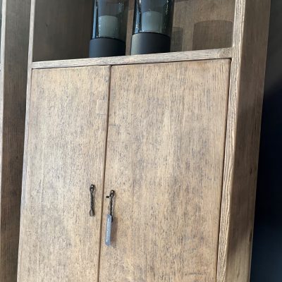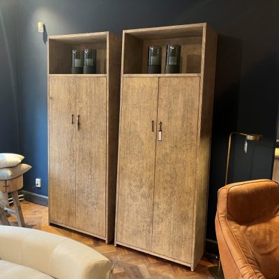 Armoire ‘Bordeaux’ en vieux pin. L’armoire a 2 portes et un compartiment ouvert et est également disponible en noir.