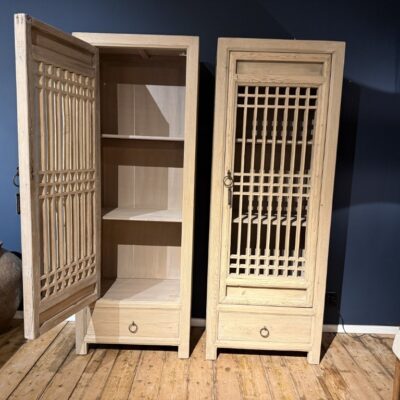 Armoire « Caracas » avec porte ouverte et tiroir, en vieux bois de pin. Disponible avec la porte gauche ou droite.