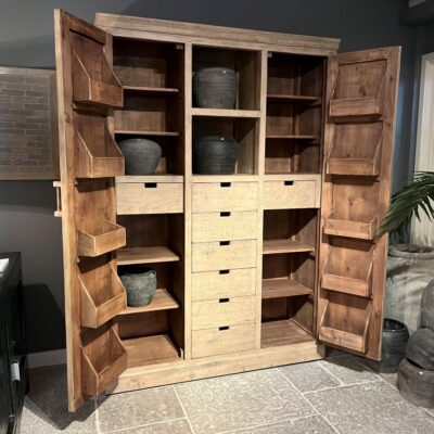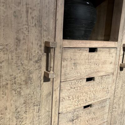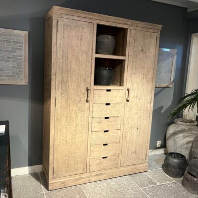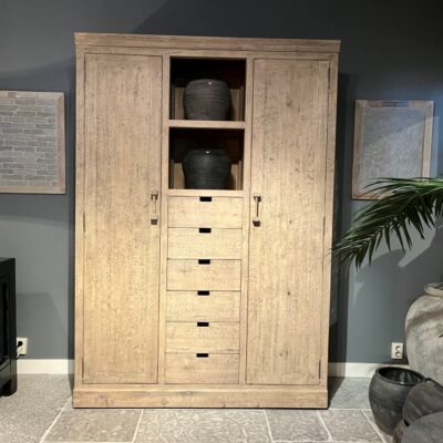 Armoire en vieux pin ‘Denver’ avec de nombreux tiroirs et plusieurs compartiments de rangement. Existe également en noir.
