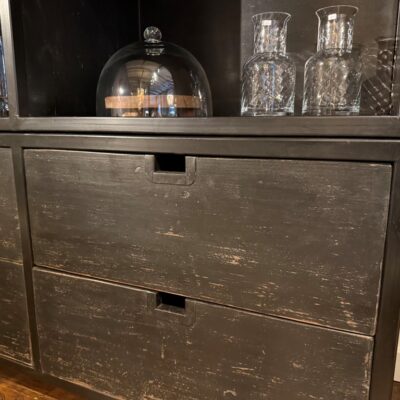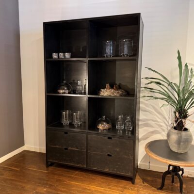 Armoire ouverte noire ‘Domburg S’ avec 4 tiroirs et 6 compartiments ouverts, en métal et vieux bois de pin.
