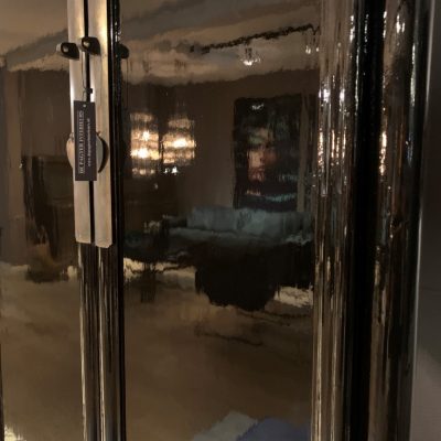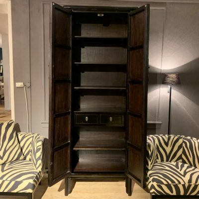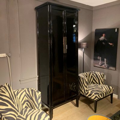 Meuble effilé laqué noir avec 2 portes. L’armoire dispose de 2 tiroirs et de 4 étagères amovibles à l’intérieur.
