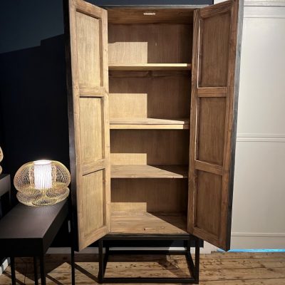 Armoire noire avec 2 portes à carreaux sur une base en métal. L’armoire dispose de 3 étagères amovibles.
