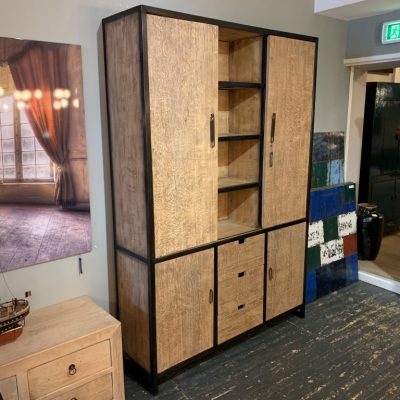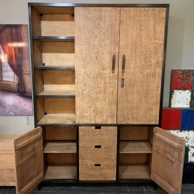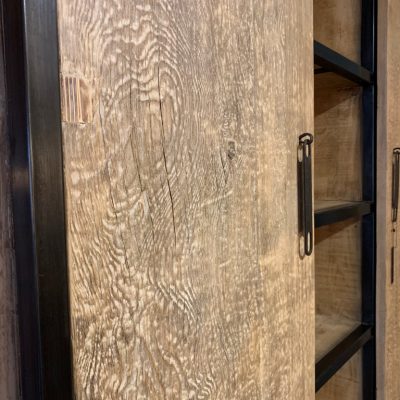 Armoire ‘Vienna’ en vieux bois de pin et métal. L’armoire comporte 2 portes coulissantes, 3 tiroirs et 2 portes-patio.