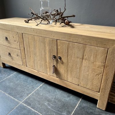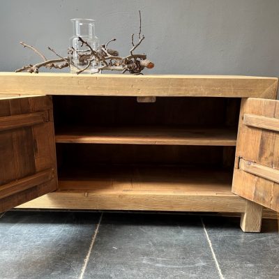 Buffet TV rural ‘Leon’ avec 2 portes et 2 tiroirs, en vieux bois de pin. Existe également en noir.