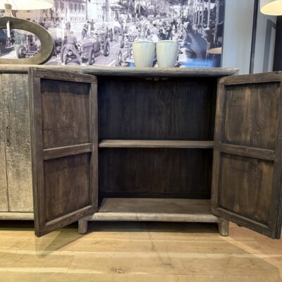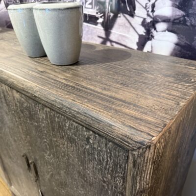 Buffet « Lagos » avec quatre portes, en vieux bois de pin. Ici, réalisé en noir, mais aussi disponible en simple bois de pin ancien.