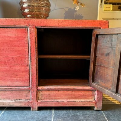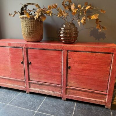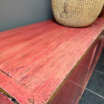 Buffet laqué rose avec trois portes, en vieux bois de pin.