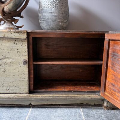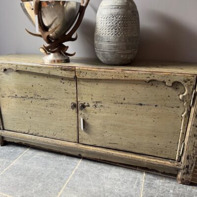 Buffet chinois ancien à 2 portes, en vieux bois de pin. Le buffet est décoré de laque verte.