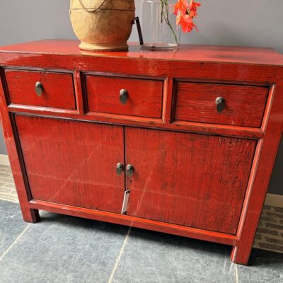 Buffet laqué rouge ‘Zaragoza’ avec 3 tiroirs et 2 portes, en vieux bois de pin. Également disponible en vieux bois de pin clair.