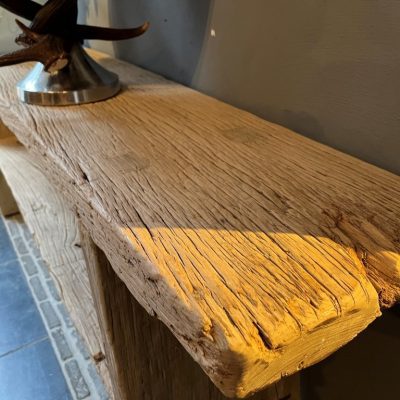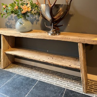 Table console champêtre ‘Rob’ avec une étagère inférieure, en bois d’orme rustique.